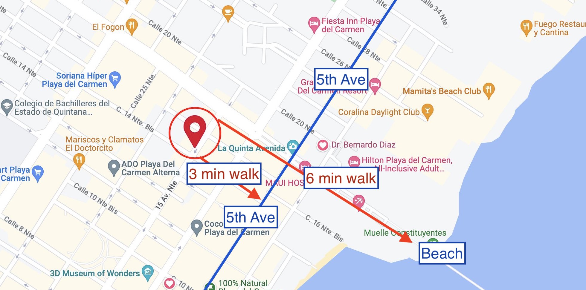 Located right in the centre of playa next to Constituents and 15 Ave., but on a quiet street. No bars, no dogs, very quiet and peaceful at night. Yet 2 blocks away from all the action and 5 min walk to the beach.